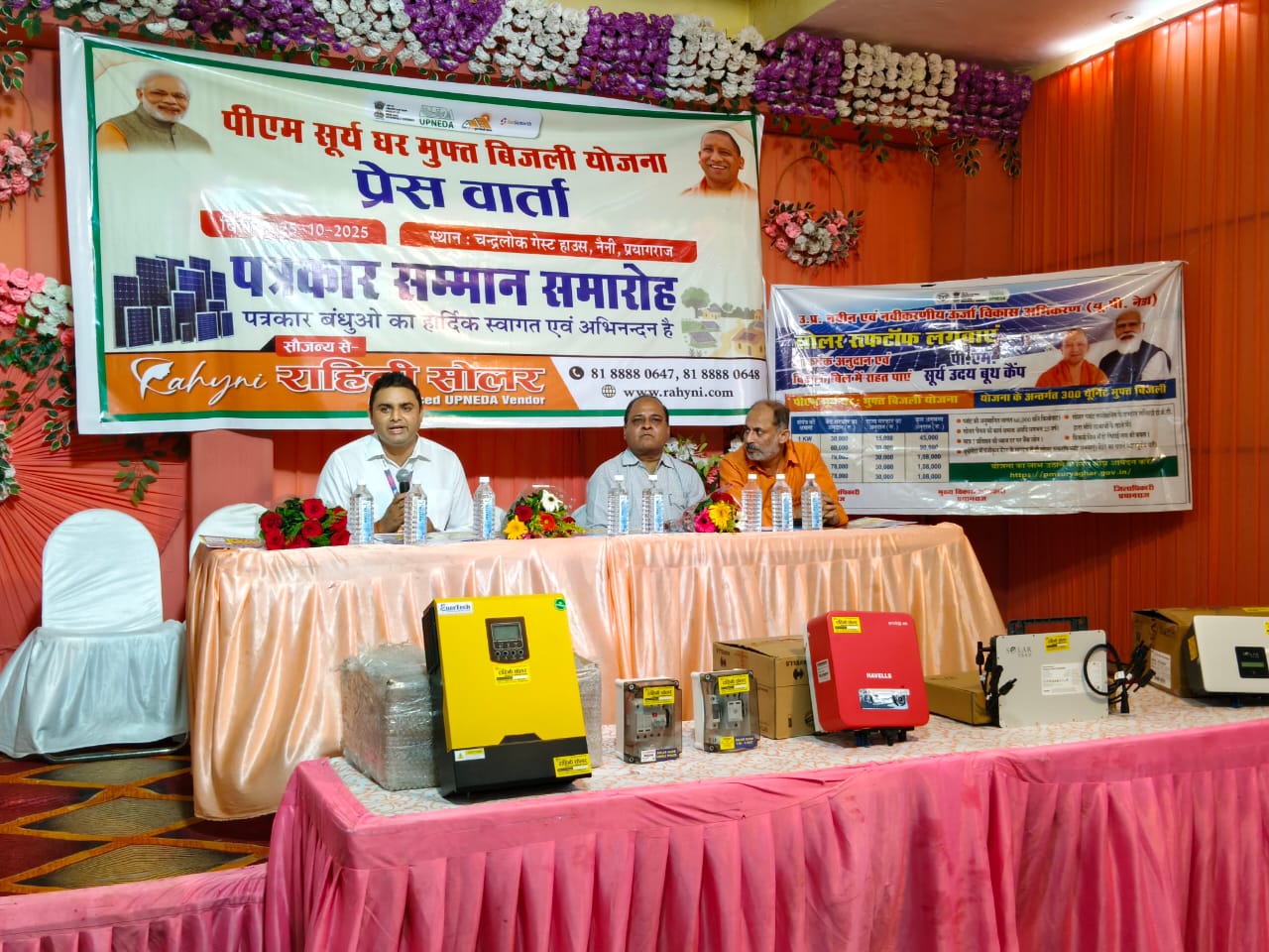 नैनी ,प्रयागराज । चन्द्रलोक गेस्ट हाउस, नैनी, प्रयागराज में भारत सरकार की महती की योजना पी०एम० सूर्य घर-मुफ्त बिजली योजना का आयोजन किया गया। जिसका मुख्य उददेश्य इस योजना से सम्बन्धित सरकारी योजना से हो रहे लाभ के बारें में बताना था। यू०पी० नेडा के परियोजना अधिकारी द्वारा इस योजना में केन्द्र सरकार व राज्य सरकार द्वारा दिये जाने वाले अनुदान से अवगत कराया। साथ ही यह भी बताया कि किस प्रकार से अनुदान के माध्यम से सोलर उपकरण में लगने वाला व्यय 75 फीसदी तक कम हो जाता है। इस कार्यक्रम के मुख्य आयोजक राहिनी सोलर के द्वारा अतिरिक्त 10 प्रतिशत की छूट देने से लाभार्थी के शुरूवाती व्यय को शुन्य कर दिया गया। इस विषय में प्रबन्धक द्वारा यह आश्वासन भी दिया गया कि बिना किसी शुरूवाती भुगतान के ही सामान्य डाक्युमेन्ट के साथ इस योजना का लाभ लिया जा सकता है। एस०बी०आई बैंक के प्रबन्धक विष्णु शुक्ला द्वारा उद्बोधन में बैकिंग द्वारा आसान प्रक्रिया से प्रोजेक्ट लागत के 90 फीसदी तक लोन कराने की बात कही गई, जिसमें मात्र 6 प्रतिशत के इन्टरनेट पन लोन सुविधा उपलब्ध कराया जायेगा।